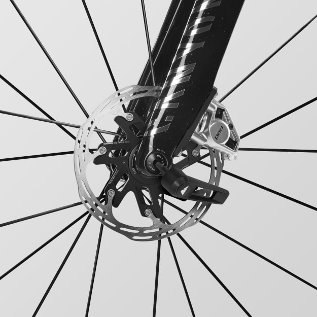 Le levier d'axe traversant amovible de l'Aeroad fait également office d'outil TX25, compatible avec la plupart des vis du vélo, et se fixe discrètement à la roue lorsqu'il n'est pas utilisé. Un outil simple pour tout réglage d'urgence sur la route. Attention : cet outil est uniquement destiné aux réglages d'urgence. Il est de la responsabilité de l'utilisateur de respecter les couples de serrage indiqués lors du serrage des boulons, qui ne peuvent pas être vérifiés avec l'outil.